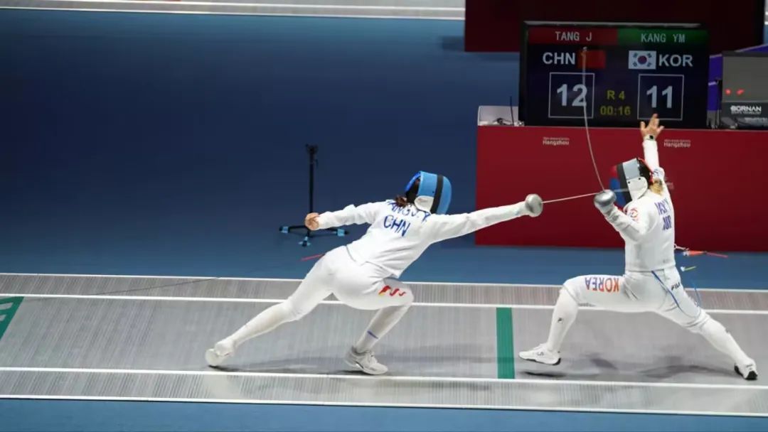 9月27日下午,第19届亚运会女子团体重剑比赛在杭州电子科技大学体育馆举行,省体校2015级击剑(重剑)队毕业生唐君瑶所在的中国队,获得女子团体重剑项目铜牌。