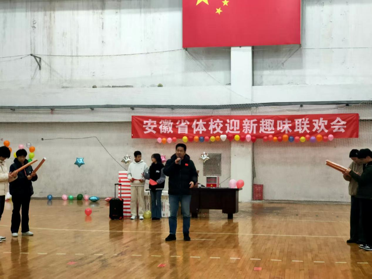 为迎接 2026 年元旦,丰富校园文化生活,营造积极向上的体育文化氛围,12 月 26 日晚,省体校于五楼手球馆举办了“青春飞扬,‘竞’享欢乐”主题元旦趣味联欢活动。安徽体院副院长兼省体校校长袁则新、副院长宋雅君、学工处副处长张前荣、学生管理科科长佟捍楠以及全体班主任老师出席,与全体同学共赴这场活力盛宴。