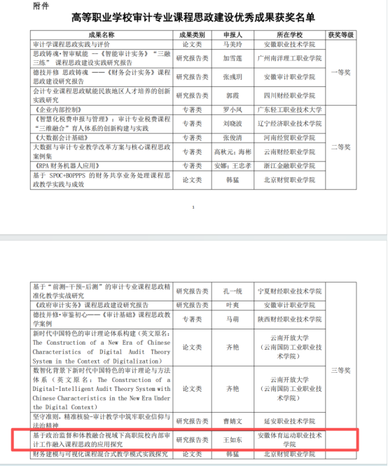 近日,由全国审计行业产教融合共同体、全国审计职业教育联盟主办的高等职业学校审计专业课程思政建设优秀成果征集评选活动公布了评选结果。本次征集的成果主要包括学术论文、专著(含案例集、教材等)和研究报告(含调研报告、教改方案等)等三类,在各院校积极推荐和申报的基础上,经专家评审、组委会审定,共评选出一等奖4项、二等奖6项、三等奖8项。学院纪委牵头撰写报送的调研报告《基于政治监督和体教融合视域下高职院校内部审计工作融入课程思政的应用探究》荣获三等奖。