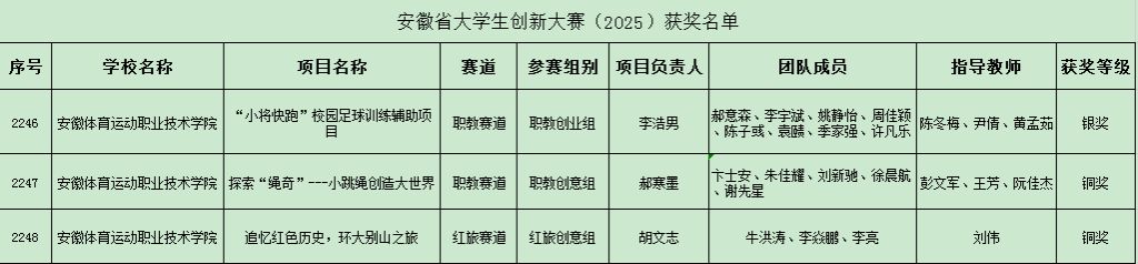 近日,由安徽省教育厅主办,安徽财经大学、安徽职业技术大学和皖西卫生职业学院共同承办的2025年安徽省大学生创新大赛圆满落幕,我院学子在此次大赛中取得佳绩。其中,李浩男(项目负责人)、郝意森、李宇斌、姚静怡、周佳颖、陈子彧、袁赜、季家强、许凡乐等9名同学提交的项目《“小将快跑”校园足球训练辅助项目》荣获职教赛道创业组银奖;郝寒墨(项目负责人)、卞士安、朱佳耀、刘新驰、徐晨航、谢先星等6名同学提交的项目《探索“绳奇”---小跳绳创造大世界》荣获职教赛道创意组铜奖;胡文志(项目负责人)、牛洪涛、李焱鹏、李亮等4名同学提交的项目《追忆红色历史,环大别山之旅》荣获红旅赛道创意组铜奖。