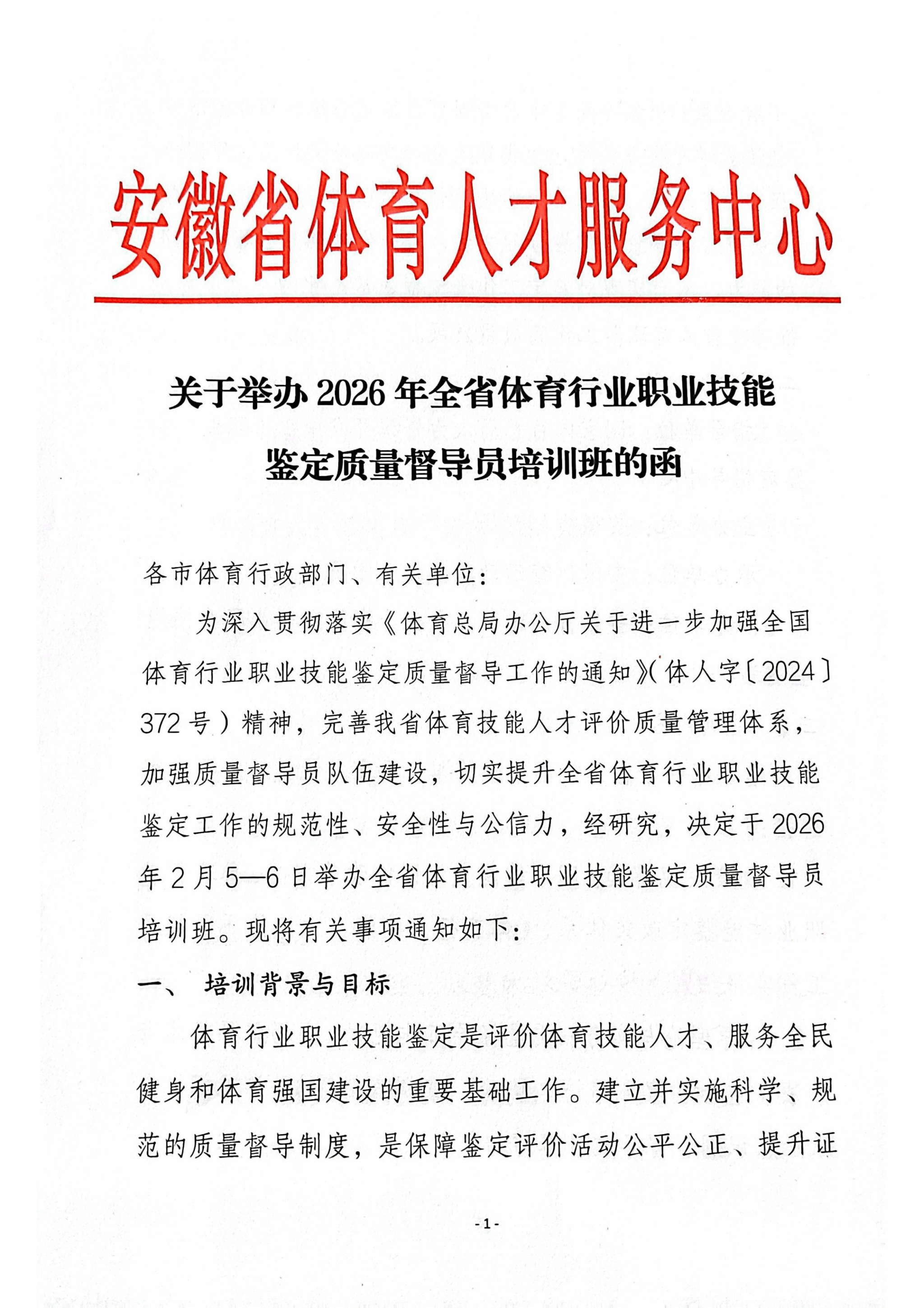 关于举办2026年全省体育行业职业技能鉴定质量督导员培训班的函